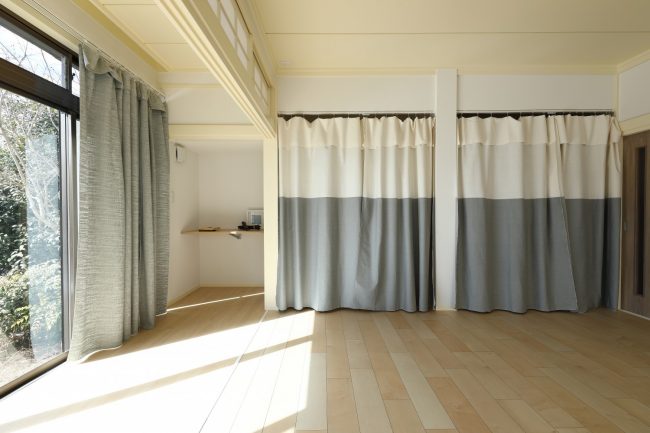収納部分は、カーテンで仕切りました。よく使うものは、カーテンのほうが出し入れがしやすいです!