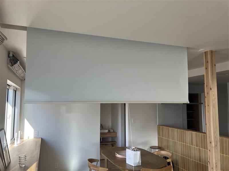 造作のソファやリビングダイニングを区切るプロジェクター用のスクリーンが特徴的です!