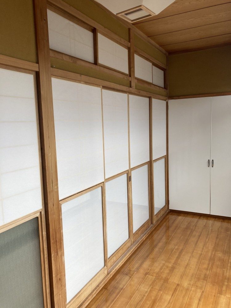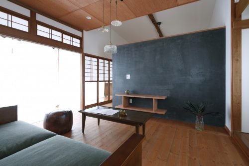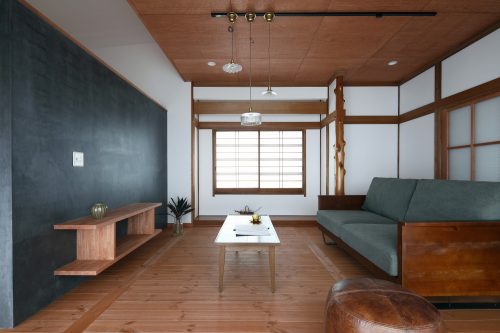 元々のお家が持つ和の雰囲気を活かしたリノベーションを心がけた。間取りは大きくいじっていないが、ワンルームタイプの空間だったためTV台の間仕切り壁を寝室スペースとリビングスペースの境にした。リビング側はアクセントになるようにモルタル調に見えるモールテックスを使用した。床は無垢材を使用し、家の雰囲気を引き立てながら足触りのいいものを選定した。障子や、柱、和室の元々の長押等はそのまま利用した。レトロな照明がお好きとのことだったので、リビングの天井にはレールを通し、小さな照明器具を多灯吊りして雰囲気を出した。