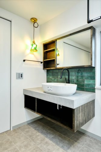 LDKの隣に寝室を配置することで、リビングに圧迫感が出ないよう配慮しました。造作の建具をL型に配置し、普段はオープンにして広々とした空間を確保できるようにしています。その隣には、ブラックのフレームで統一した室内窓を設置し、閉塞的になりがちなワークスペースにも抜け感を与えています。洗面室の天板にはモールテックスという左官材を使用し、水に濡れても問題ないようにしつつ、全体のデザインとも調和するよう仕上げました。充実した収納スペースにより、すっきりとした暮らしを実現する住まいが完成しました。