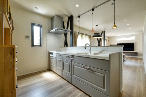 全体的に明るい雰囲気を持ちながら、要所に黒を使ってカッコよさも演出しました。広々としたLDKも魅力ですが、一番の見どころは水まわりの動線です。洗面脱衣室と洗濯室が別れていますが、脱いだ衣類をそのまま洗濯室に送ることができる仕組みを採用しており、家事が楽になります。ランドリーは一時干し用の物干しや汚れものを手洗いできるスロップシンク、ガス式の衣類乾燥機なども備えており、使い勝手抜群です。