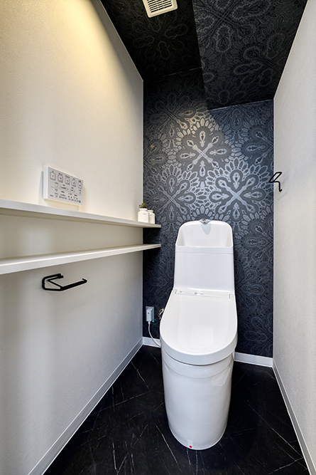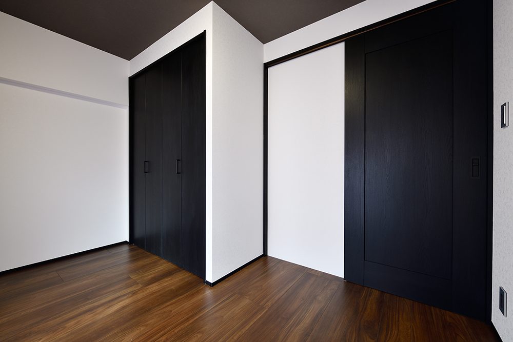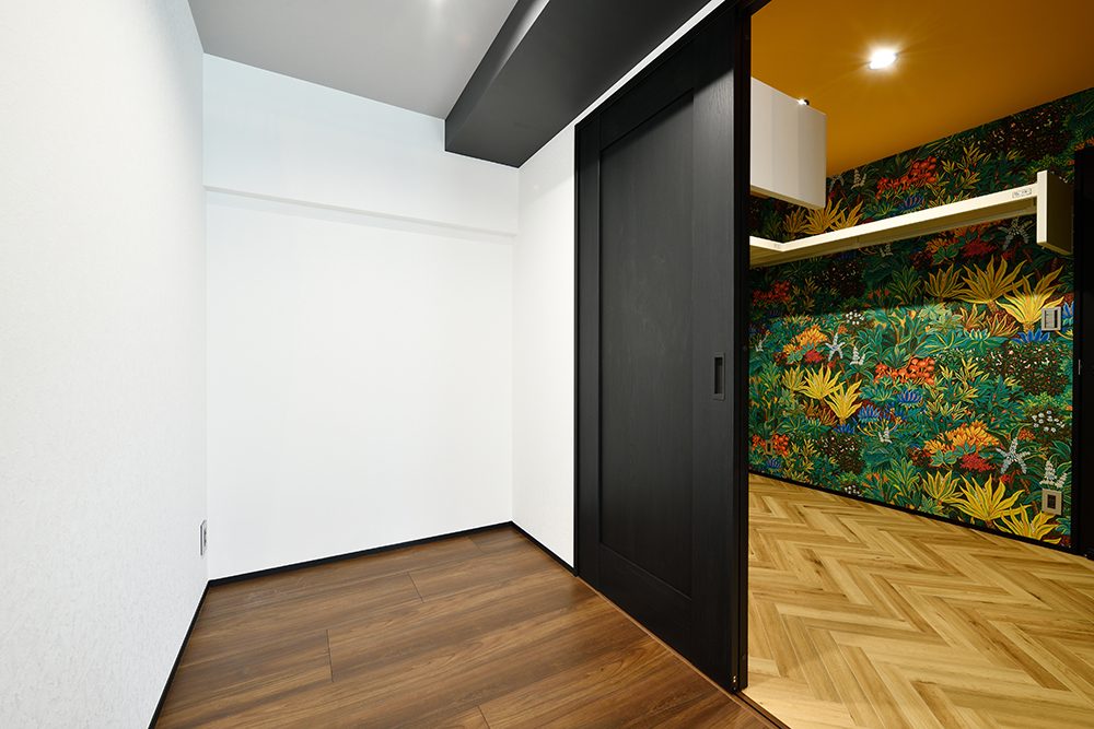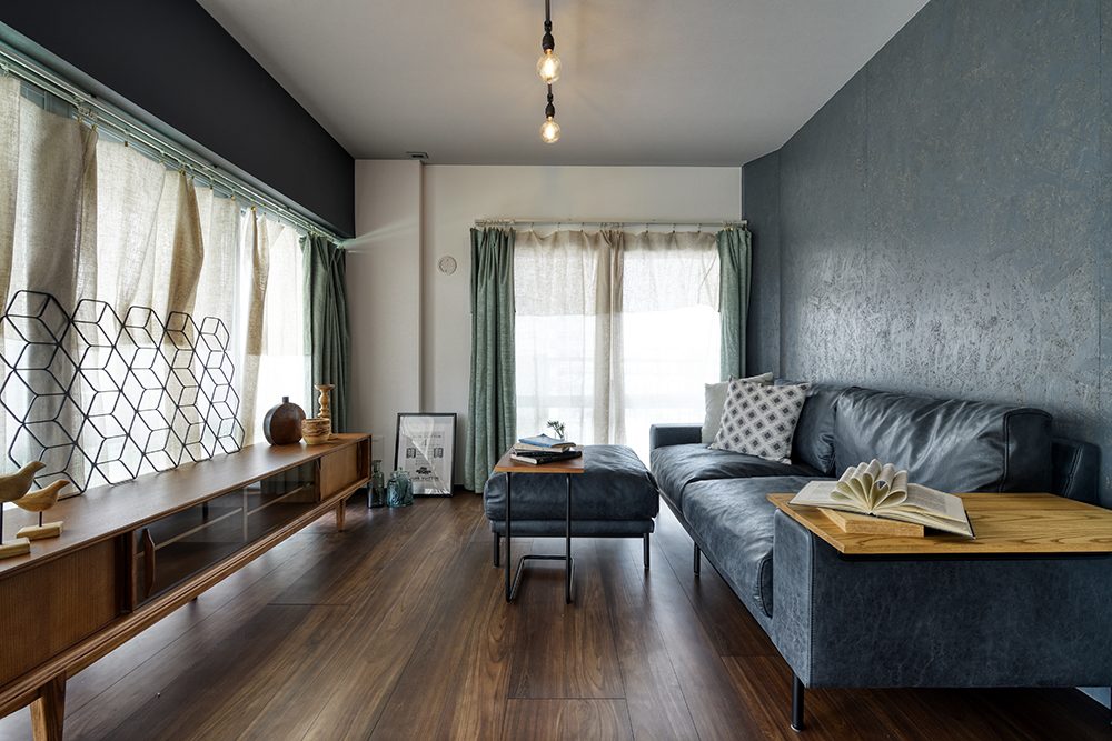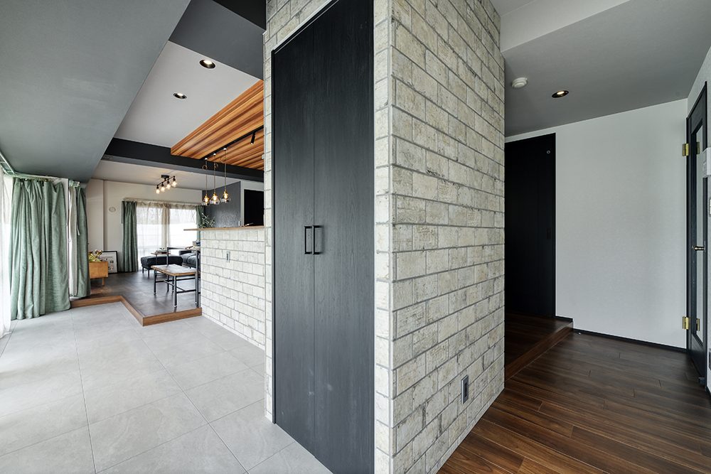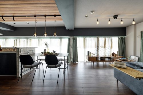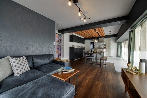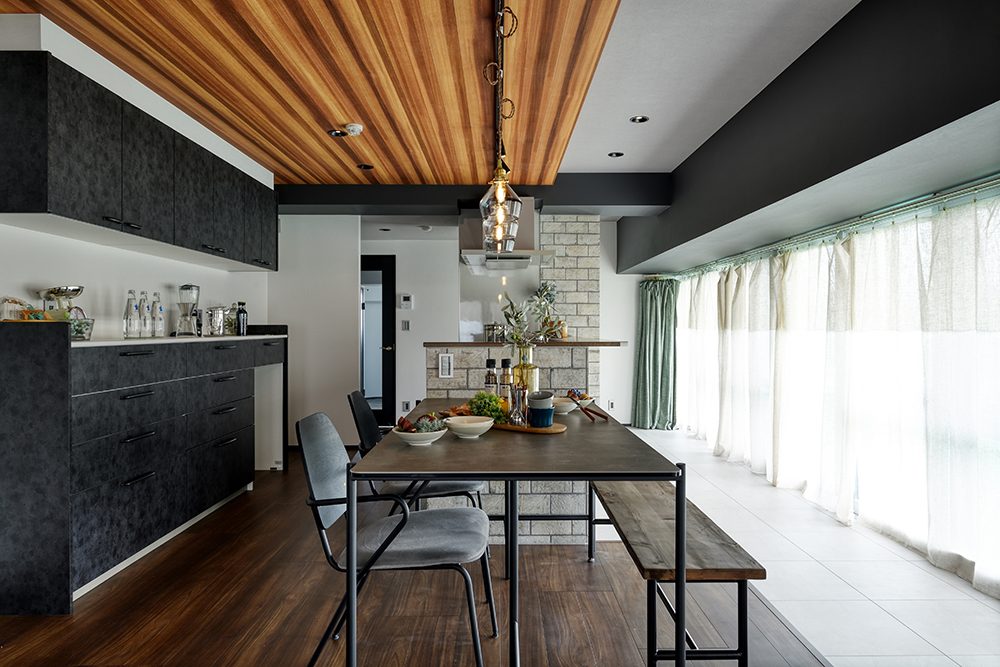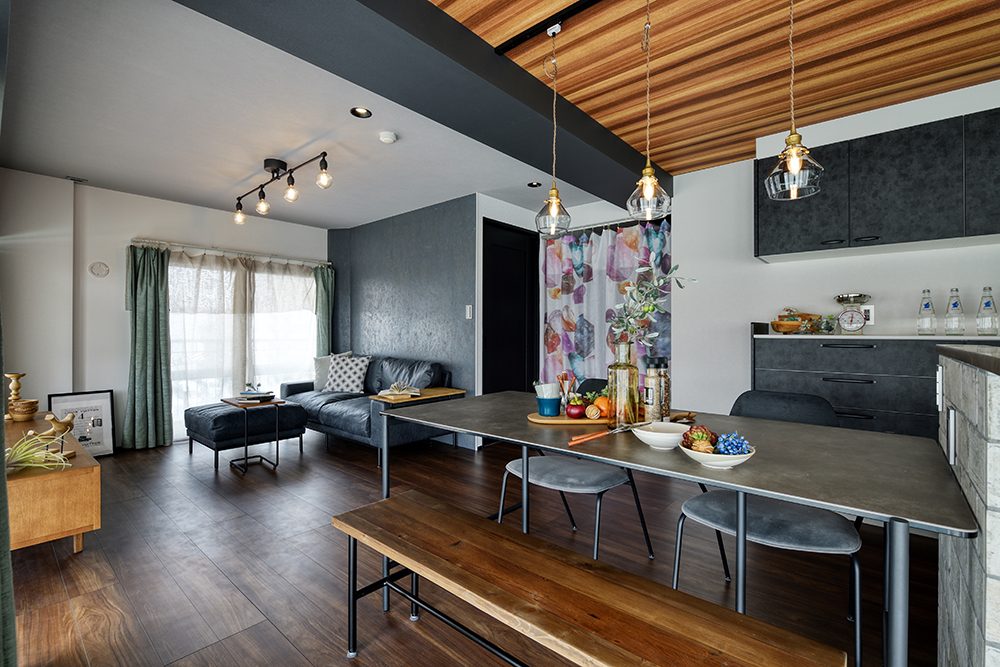 間取りにはゆとりを持たせつつ、内装には空間を引き締める黒をアクセントに採用。床と天井には木目を取り入れ、横方向に広がりを感じられるようにデザインを調整しました。日中は、窓からの光が差し込む開放的な空間。夜になりカーテンを閉めれば、一転して落ち着いた雰囲気に変化します。昼と夜で表情を変える、環境と調和した住まいが完成しました。