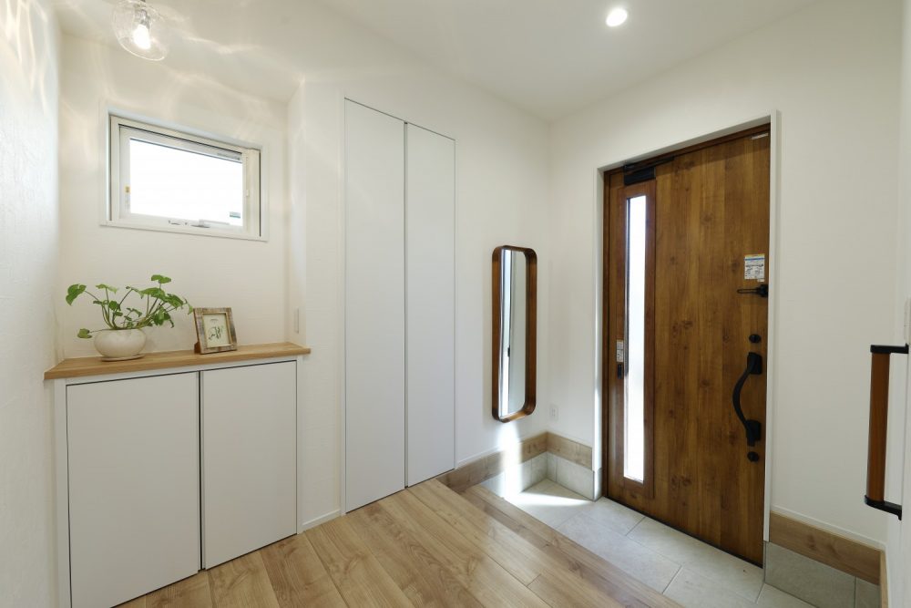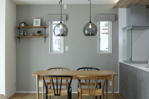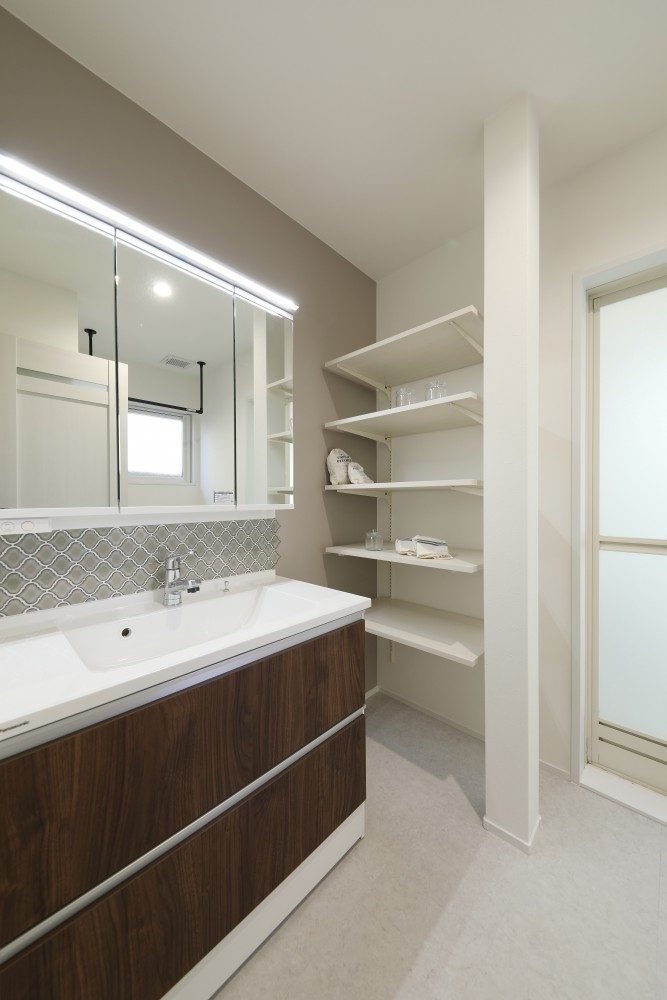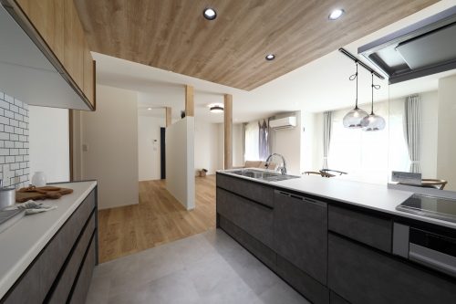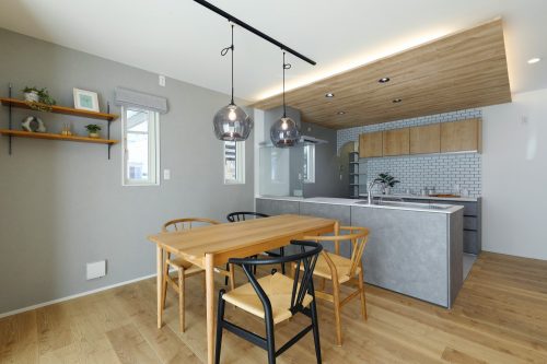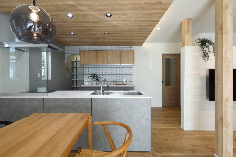 対面キッチンを中心に、家族の気配を感じながら家事ができる間取りと動線計画を大切にしました。収納の位置や使い勝手まで丁寧に整えることで、日々の暮らしが無理なく心地よくまわる住まいをご提案しました。