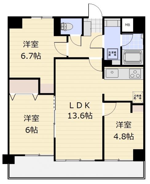 | 間取り | 3LDK | 間取り内訳 | LDK13.6畳×1室 洋6.7畳×1室 洋6畳×1室 洋4.8畳×1室 |