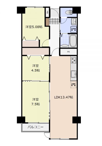 | 間取り | 3LDK | 間取り内訳 | 洋7.5/洋5.08/洋4.5/LDK13.47 |
