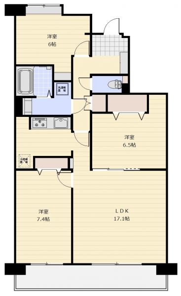 | 間取り | 3LDK | 間取り内訳 | LDK17.1畳×1室 洋7.4畳×1室 洋6.5畳×1室 洋6畳×1室 |