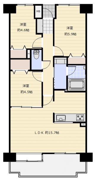 | 間取り | 3LDK | 間取り内訳 | 6FLDK15.7畳×1室 6F洋5.9畳×1室 6F洋4.6畳×1室 6F洋4.5畳×1室 |