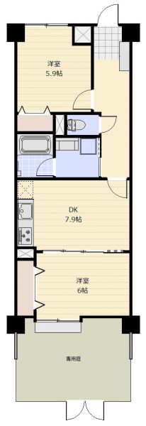 | 間取り | 2DK | 間取り内訳 | DK7.9畳×1室 洋6畳×1室 洋5.9畳×1室 |
