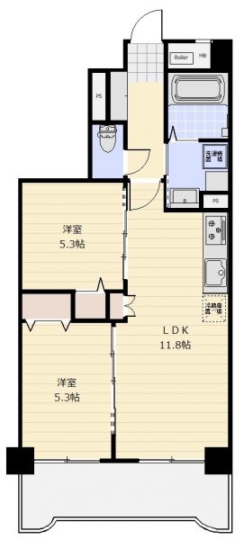 | 間取り | 2LDK | 間取り内訳 | 洋5.4畳×1室 洋5.3畳×1室 LDK11.8畳×1室 |