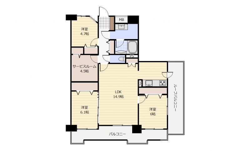 間取り | 3SLDK | 間取り内訳 | LDK14.9畳×1室 洋6.1畳×1室 洋6畳×1室 洋4.7畳×1室 S4.5畳×1室 |