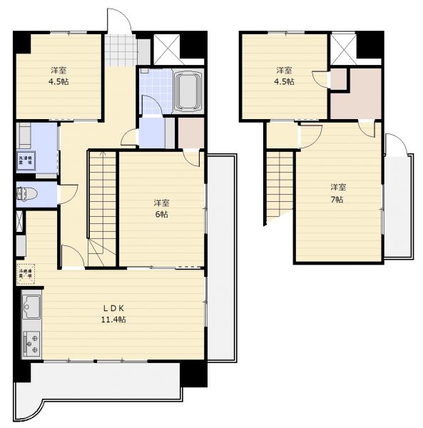 | 間取り | 4LDK | 間取り内訳 | LDK11.4畳×1室 洋7畳×1室 洋6畳×1室 洋4.5畳×2室 |