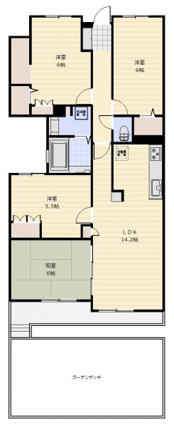 | 間取り | 4LDK | 間取り内訳 | LDK14.2畳×1室 洋6畳×2室 洋5.5畳×1室 和6畳×1室 |