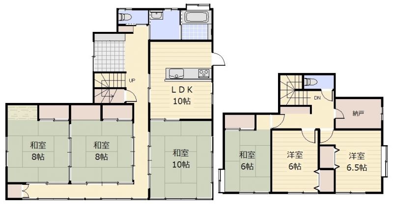 | 間取り | 6SLDK | 間取り内訳 | 1F和10畳 1F和8畳×2室 1FLDK10畳 2F洋6.5畳 2F洋6畳 |