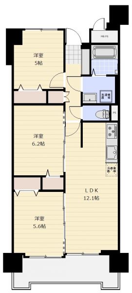 | 間取り | 3LDK | 間取り内訳 | 洋6.2畳×1室 洋5.6畳×1室 洋5畳×1室 LDK12.1畳×1室 |