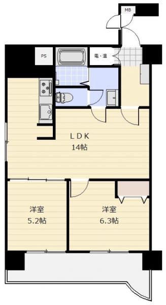 間取り | 2LDK | 間取り内訳 | LDK14畳×1室 洋6.3畳×1室 洋5.2畳×1室 |