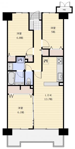 | 間取り | 3LDK | 間取り内訳 | 洋6.8畳×1室 洋6.1畳×1室 洋5畳×1室 LDK13.7畳×1室 |