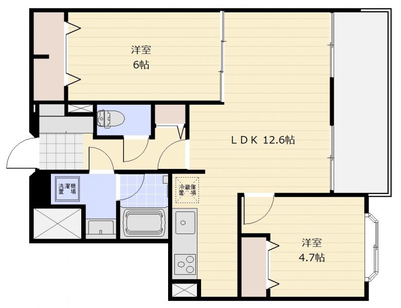 | 間取り | 2LDK | 間取り内訳 | LDK12.6畳×1室 洋6畳×1室 洋4.7畳×1室 |