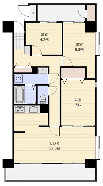 | 間取り | 3LDK | 間取り内訳 | LDK13.6畳×1室 洋6畳×1室 洋5.5畳×1室 洋4.2畳×1室 |