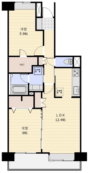 | 間取り | 2LDK | 間取り内訳 | LDK12.4畳×1室 洋6畳×1室 洋5.9畳×1室 |