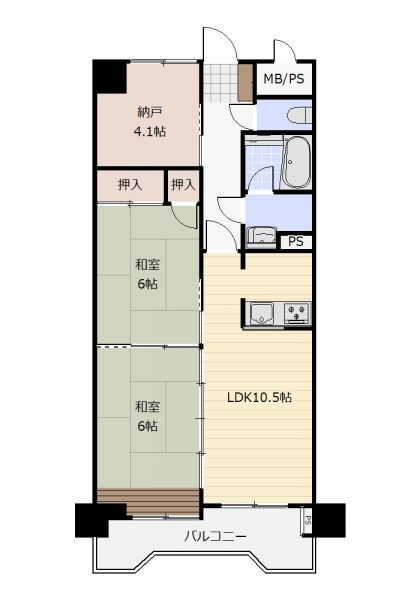 | 間取り | 2SLDK | 間取り内訳 | 和6畳×2室 S4.1畳×1室 LDK10.5畳×1室 |