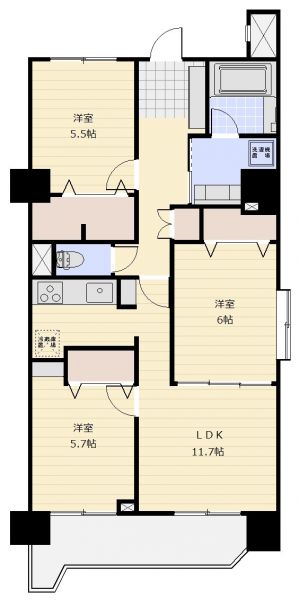 | 間取り | 3LDK | 間取り内訳 | LDK11.7畳×1室 洋6畳×1室 洋5.7畳×1室 洋5.5畳×1室 |