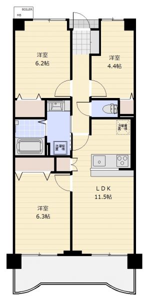 | 間取り | 3LDK | 間取り内訳 | 洋6.3畳×1室 洋6.2畳×1室 洋4.4畳×1室 LDK11.5畳×1室 |
