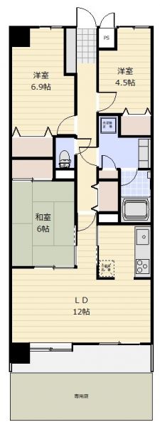 | 間取り | 3LDK | 間取り内訳 | 1FLDK12畳×1室 1F和6畳×1室 1F洋6.9畳×1室 1F洋4.5畳×1室 |