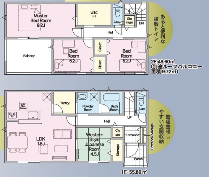 | 設備 | 温水洗浄便座、トイレ2ヶ所、追焚機能、浴室乾燥機、システムキッチン、カウンターキッチン、浄水器、床下収納、洗髪洗面化粧台、電気、都市ガス、上水道、浄化槽、複層ガラス、モニタ付インターホン、ディンプルキー、ルーフバルコニー、駐車場3台分、建設住宅性能評価取得(予定含む)[火災警報器等設置済] | ||