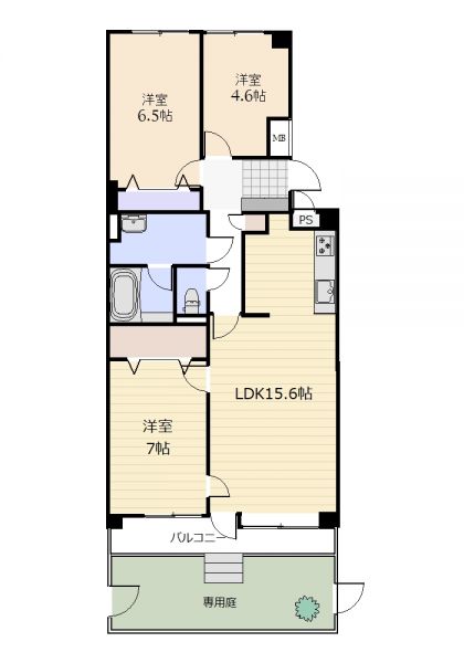 | 間取り | 3LDK | 間取り内訳 | LDK15.6畳×1室 洋7畳×1室 洋6.5畳×1室 洋4.6畳×1室 |