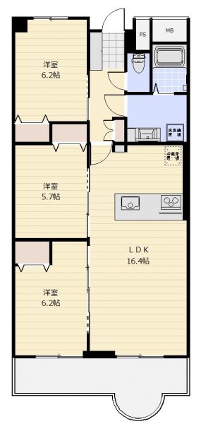 | 間取り | 3LDK | 間取り内訳 | 洋6.2畳×1室 洋6畳×1室 洋5.6畳×1室 LDK16.4畳×1室 |