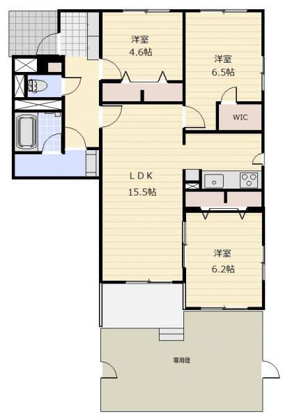 | 間取り | 3LDK | 間取り内訳 | LDK15.5畳×1室 洋6.5畳×1室 洋6.2畳×1室 洋4.6畳×1室 |